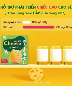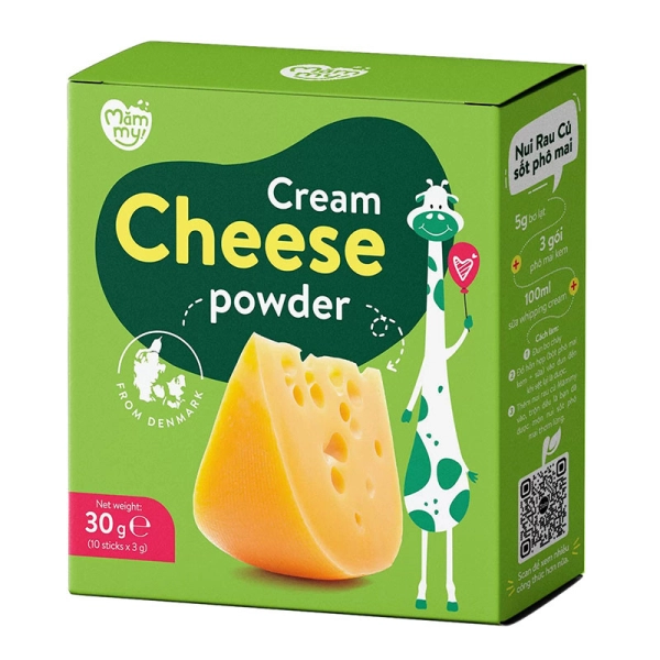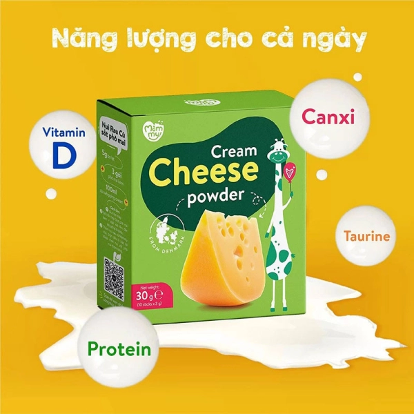 Cream Cheese Powder (Phô mai) được bào chế dưới dạng bột mịn xốp; đây là nguồn nguyên liệu được nhập khẩu trực tiếp từ Đan Mạch. Ngoài ra, sản phẩm còn được bổ sung bột kem không chứa sữa; bột kem sữa. Mỗi túi phô mai tách muối chứa 130mg canxi; năng lượng 55kcal; lượng protein gấp 5 lần và canxi cao gấp hơn 8 lần so với thành phần của sữa tươi tự nhiên.