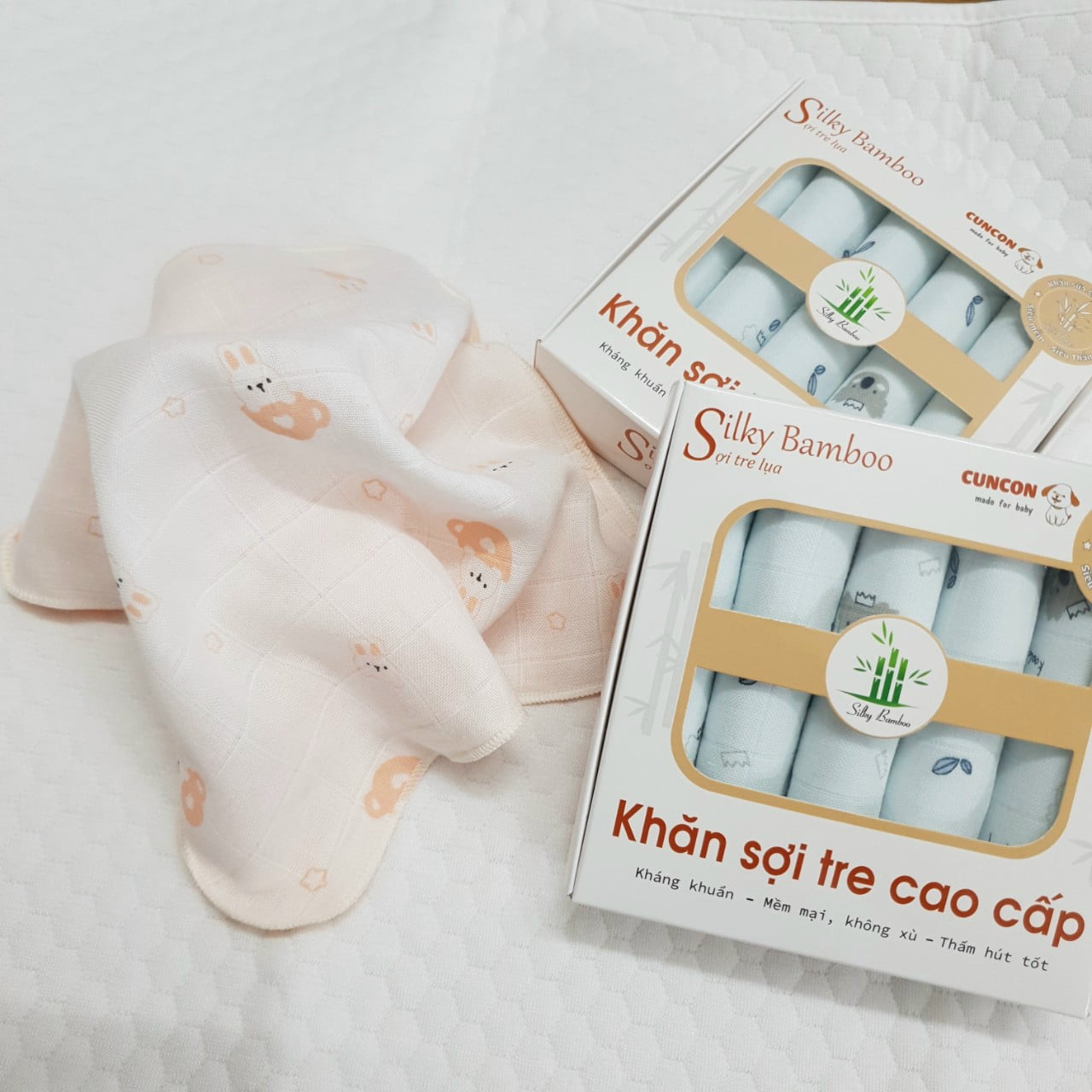 Sản phẩm được làm bằng chất liệu 70% bamboo 30% cotton, trong đó cotton giúp cho khăn được thấm hút và mềm mại hơn khăn có thành phần 100% sợi bamboo.