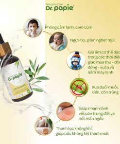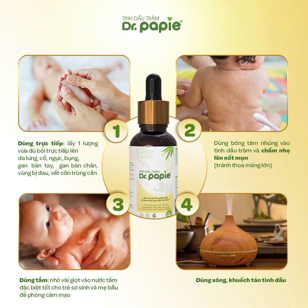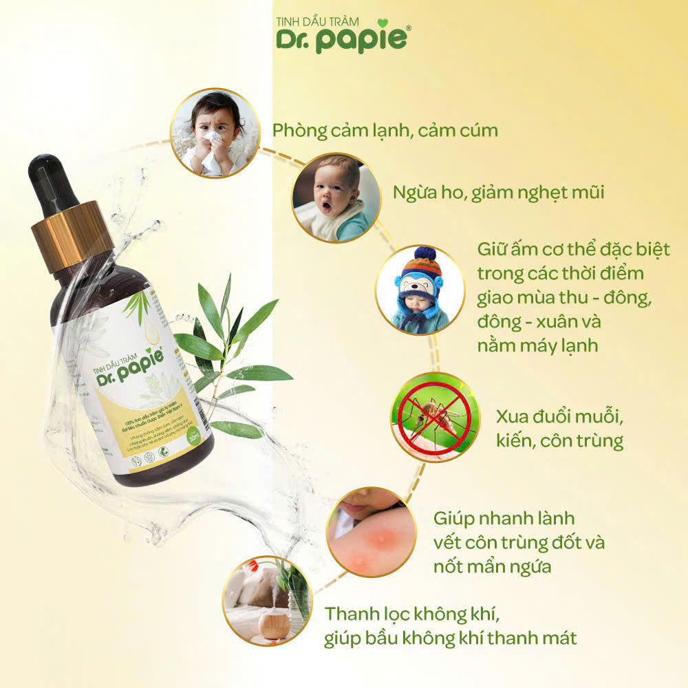 Hai hợp chất quan trọng là Cineol Cineol (40–70%) và α-Terpineol (5–12%) trong lá tràm gió nổi bật với khả năng kháng khuẩn, kháng viêm, thông mũi, làm sạch đường hô hấp, kháng côn trùng, giảm đau và mang lại cảm giác thư giãn được nhiều người tin dùng. Tinh dầu tràm gió Dr.Papie được sản xuất với quy trình hiện đại, cam kết 100% tinh dầu tràm gió tự nhiên, không pha lẫn tạp chất, đảm bảo an toàn tuyệt đối cho trẻ sơ sinh, phụ nữ mang thai, sản phụ.