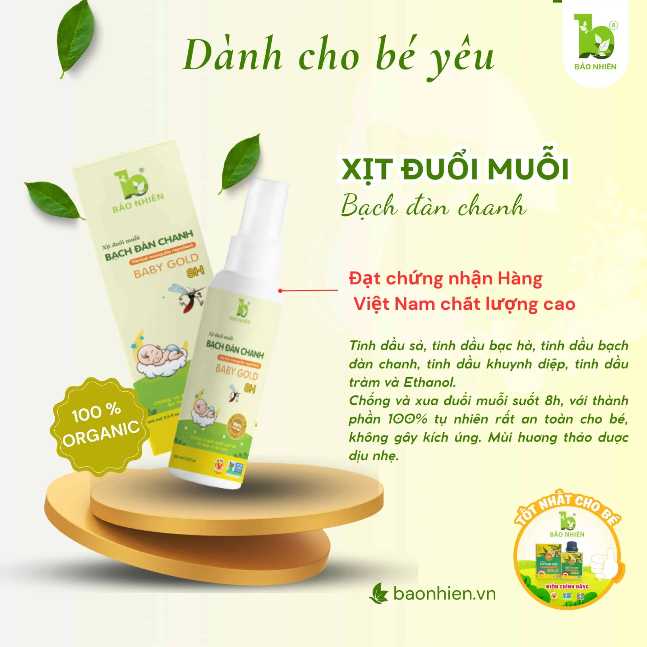 Xịt đuổi muỗi bạch đàn chanh Bảo Nhiên với thành phần 100% tự nhiên giúp chống và xua đuổi muỗi suốt 8h an toàn cho bé, không gây kích ứng, mùi hương thảo dược dịu nhẹ.